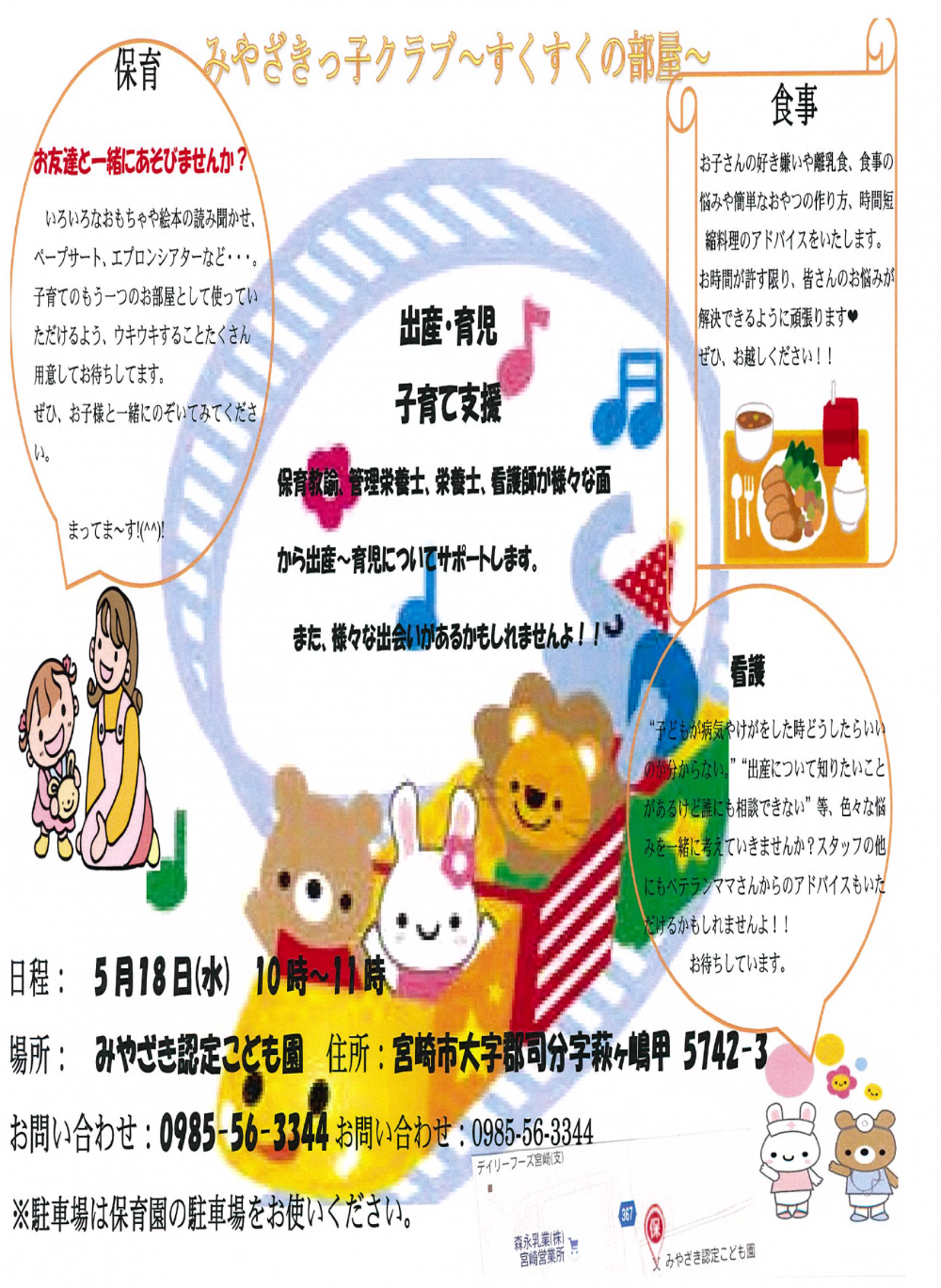 みやざき認定こども園特製の美味しい手作りのおやつやお茶もご用意しておりますので、みなさまお気軽にご参加ください♬