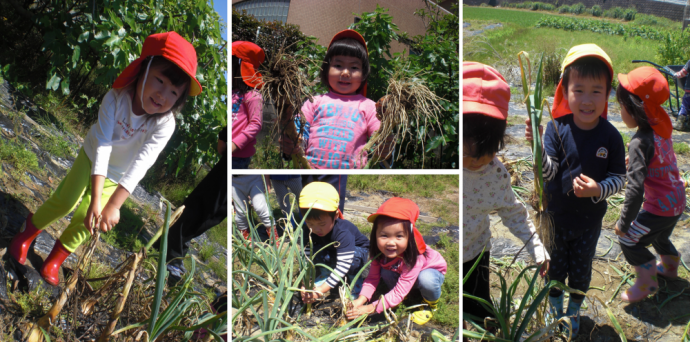 今日は園の菜園にてうめ組さん(3歳児)が新玉ねぎの収穫を行いました。