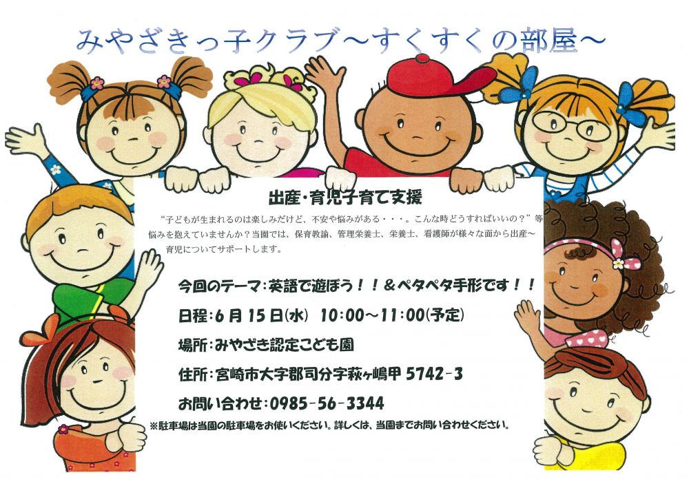 子育て支援「みやざきっ子すくすくの部屋」が6月15日(水)に開催することが決定いたしました!今回のテーマは「英語で遊ぼう!!&ぺたぺた手形!!」です。