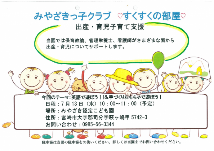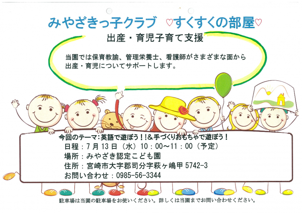 子育て支援「みやざきっ子すくすくの部屋」を7月13日【水】に開催いたします♬