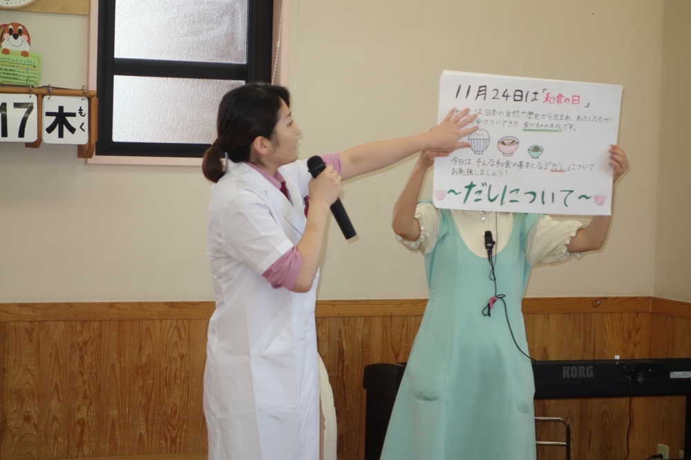 今月は11月24日が「和食の日」ということで和食やだしについて栄養士の先生に教えていただきました😃