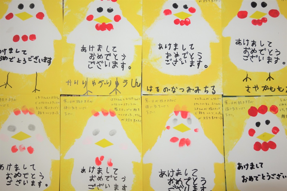 今年は酉年ということで「とり」をモチーフにした年賀状を各ご家庭のおじい様、おばあ様のご自宅に郵送させていただきました。それぞれお子様方が作られたものになっています。