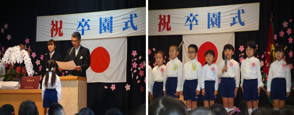 厳かな雰囲気の中、0歳児のもも組さんから卒園児のまつ組さんまで参加しました。修了生のお子様方が式に参加しお祝いしている姿や卒園生が卒園証書を立派に受けとる姿に私たちも本当に感動いたしました。