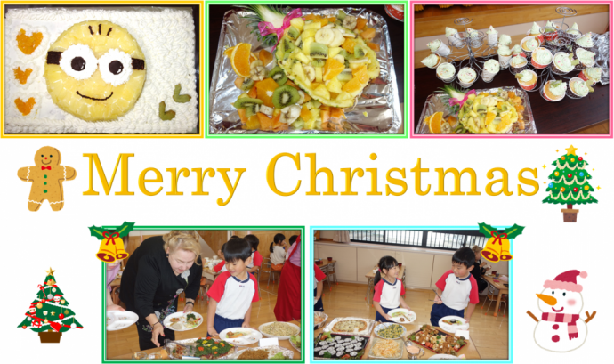 ツリー型のハンバーグやアンパンマンとミッキーの形の太巻き、大きなミニオンケーキにブッシュドノエルなど盛りだくさんのメニューになりました🍗