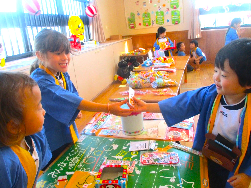 それぞれ園でつくったお財布とお金をもって、射的・お魚釣り・くじ引き・わなげなどのコーナーであそびました🎵