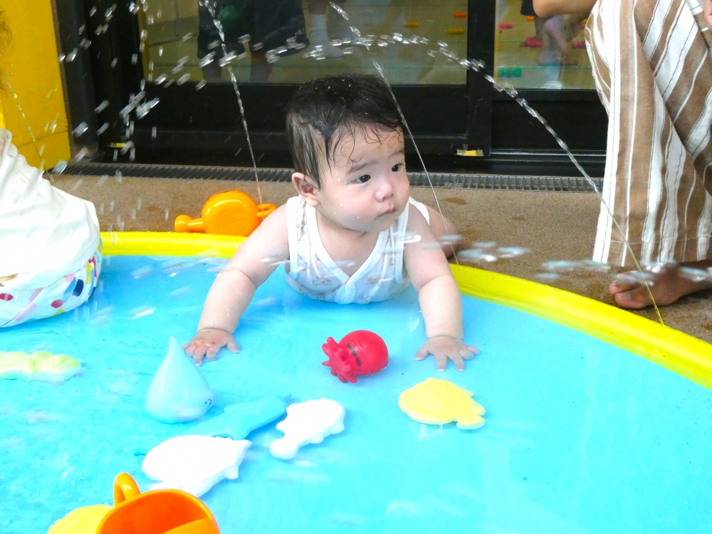 こども園のプール開きにあわせて子育て支援の方でも、シャワーマットの上で水遊びを楽しみました🎵