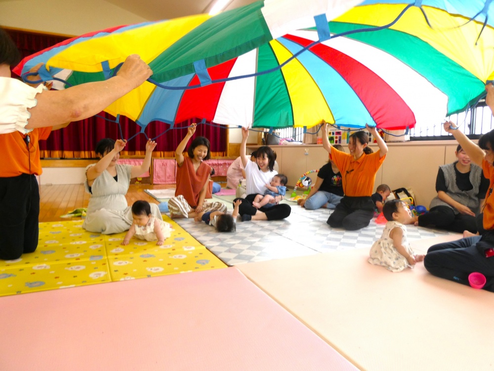 パラバルーンリトミックではピアノの音楽にあわせてパラバルーンの上に乗ったり、下に入ってみたり、親子でたくさん身体を動かしました😆