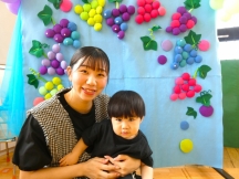 フォトスタジオはぶどう狩りをテーマにぶどうの飾り付けを準備しました♪お母様と一緒で笑顔のかわいい写真が撮れましたね😊✨✨